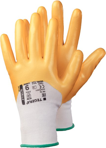 EN ISO 21420 und EN 388, Kat. 2, Level 3121A. Flexibler und verschleißfester Allroundhandschuh aus gestricktem Polyester mit Nitrilbeschichtung. Auch für nasse und ölige Arbeiten geeignet. Ohne Chrom und Silikon.